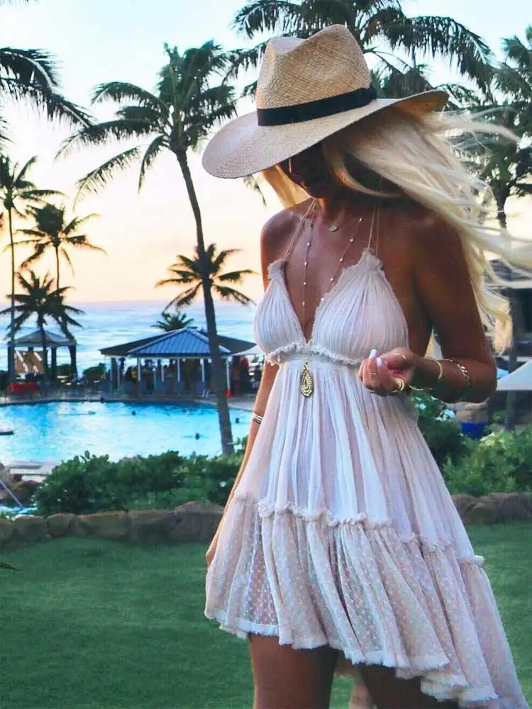 BOHO INSPIRED summer dress cotton lace pleated halter backless beach dresses V-neck sexy dress women bohemian vestidos 2021